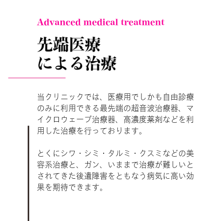 ”健康な人生と美しさを最先端医療でつくる”をCONCEPTに、私たちは最先端医療テクノロジーで美しく、健康で、豊かな人生づくりのお手伝いをいたします。